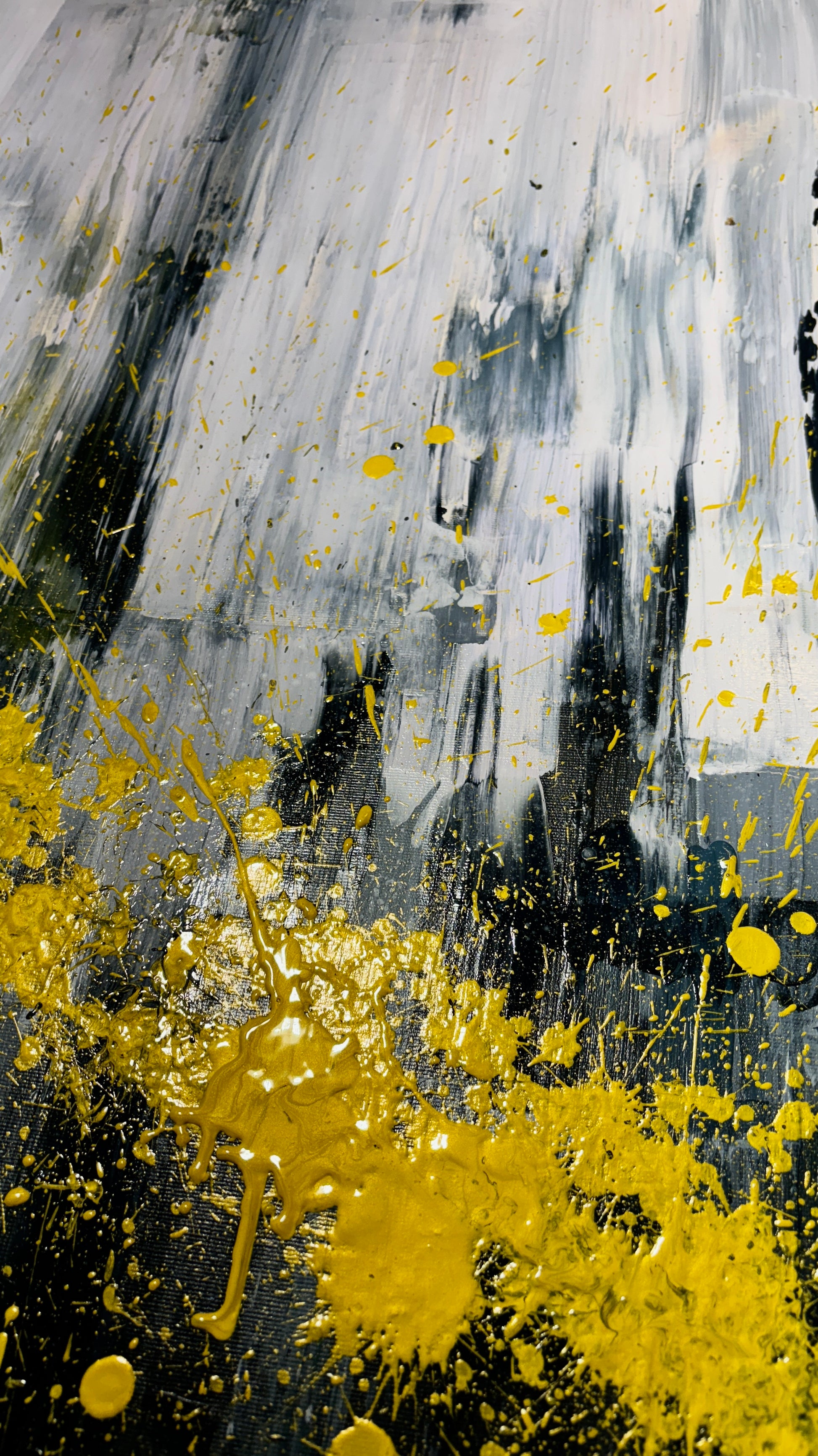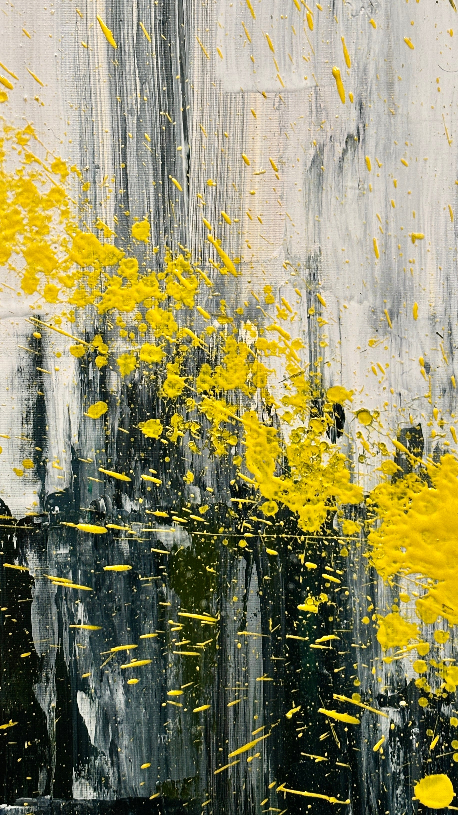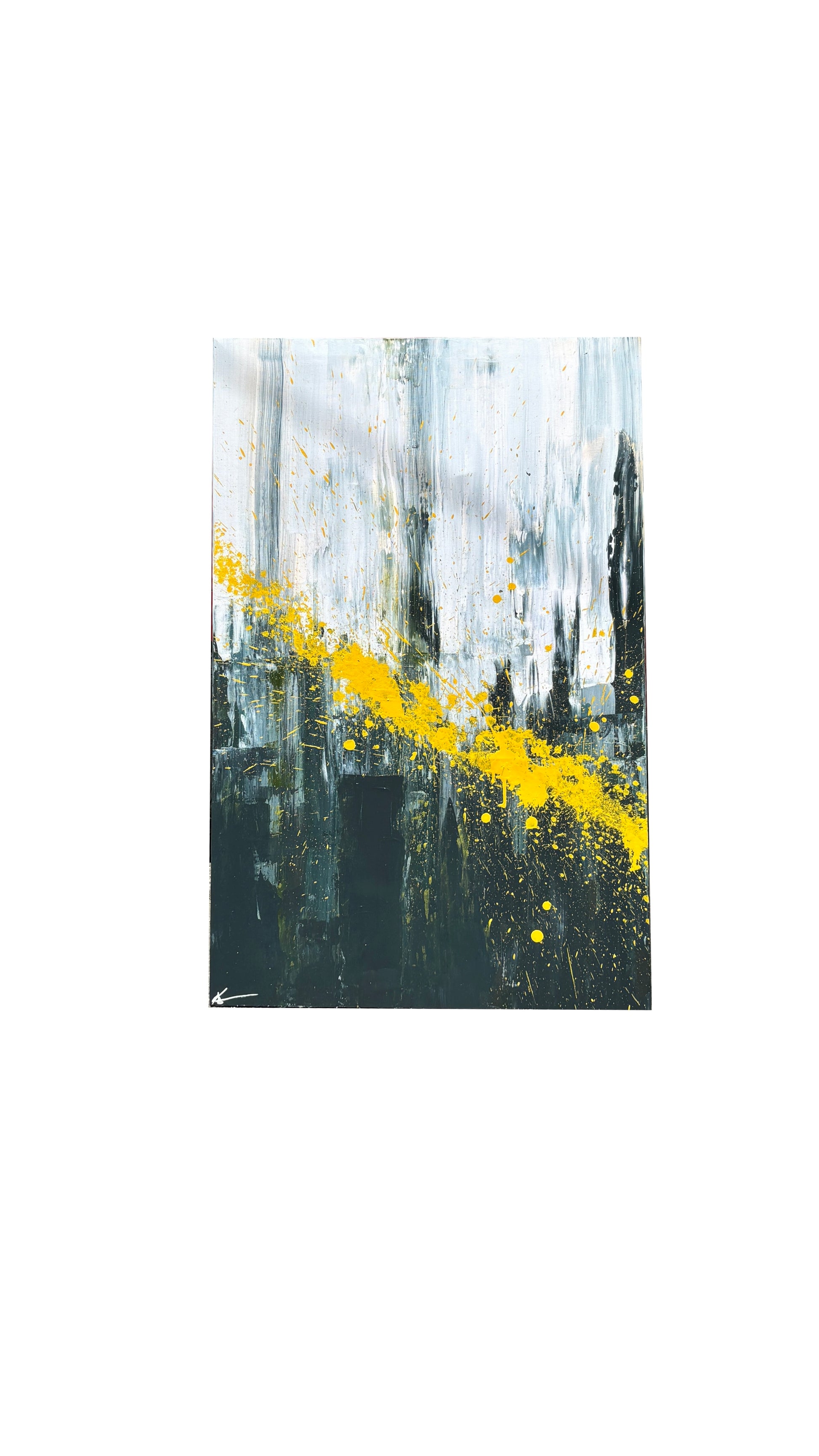"Skyline" is a striking acrylic painting measuring 90x120 cm, featuring a palette dominated by dark green and white hues, punctuated by a bold splash of yellow. The composition resembles an urban skyline, where the yellow accent serves as a focal point amidst the architectural contours. The interplay of colors and shapes creates a sense of depth and perspective, inviting viewers to explore the dynamic cityscape depicted. "Skyline" captures the essence of bustling urban life while celebrating the vibrancy of color and form in a contemporary artistic expression.
