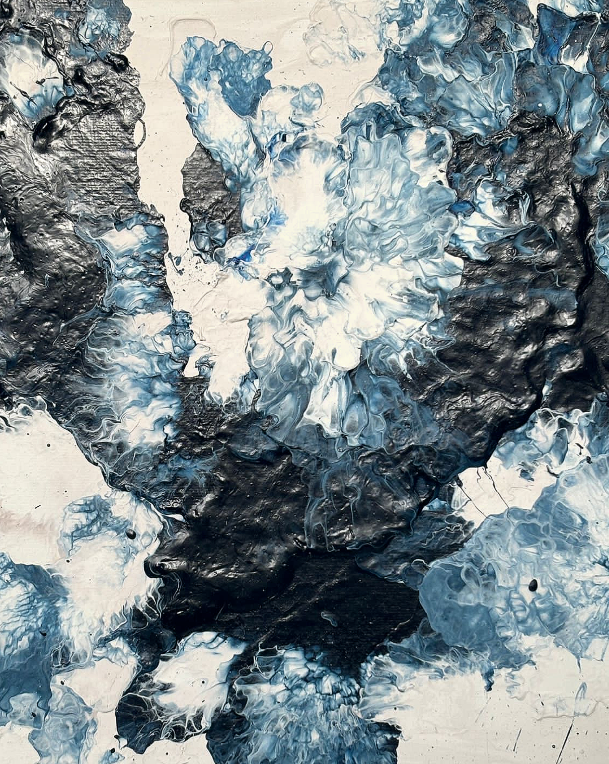 Expanding upon the tranquil series, "Azure Reverie III" weaves calming cerulean blues and pristine whites, inviting viewers into a harmonious and contemplative realm. The interplay of fluid cerulean hues and ethereal whites evokes peaceful elegance, offering a brief escape into a world of serene beauty. As a seamless addition to the "Azure Reverie" series, this artwork deepens the exploration of calm introspection and ephemeral mystery.