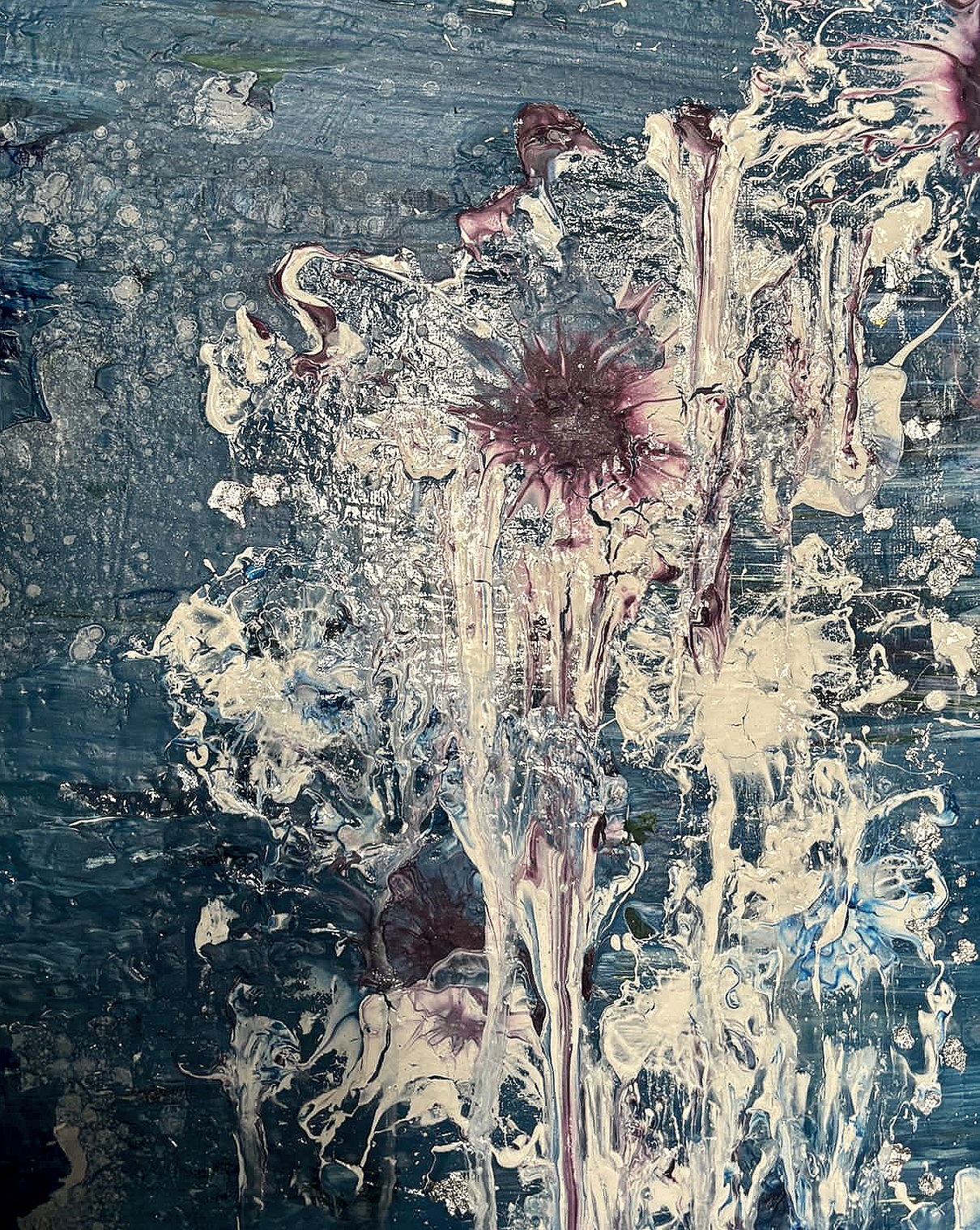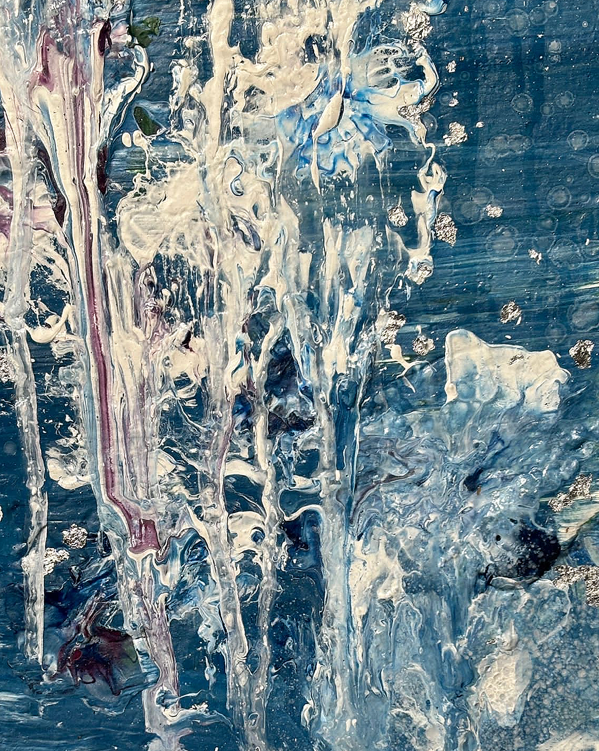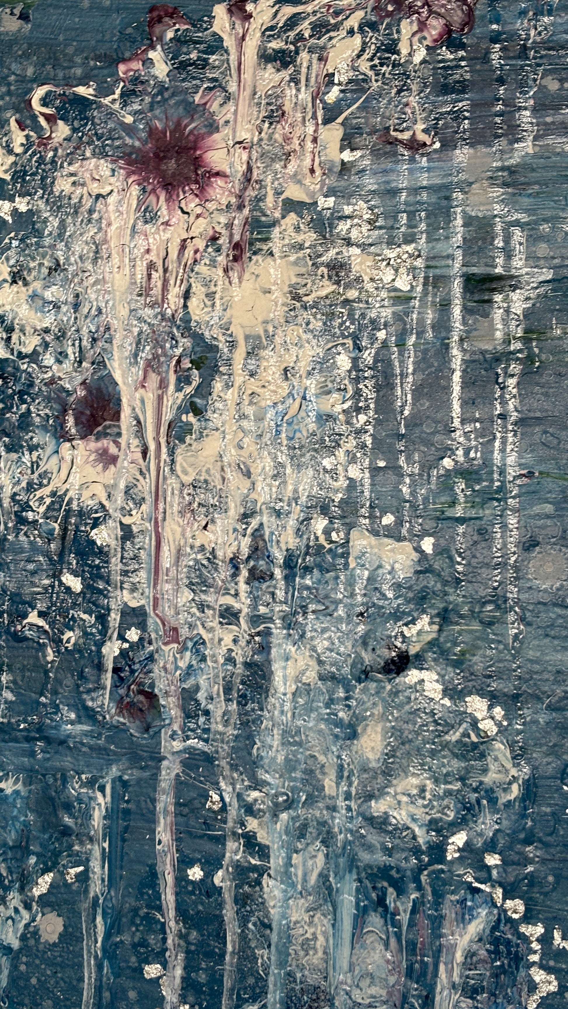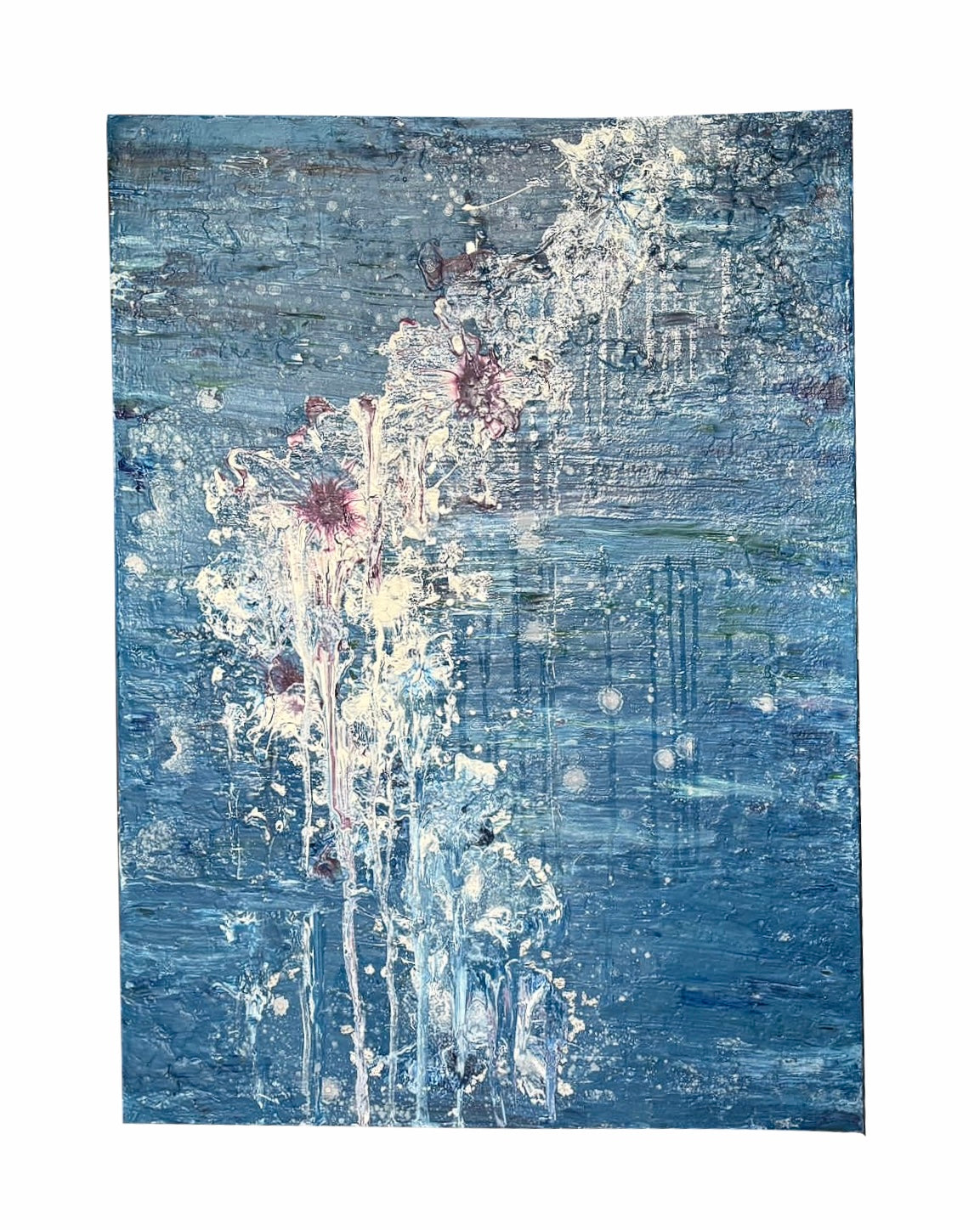 In "The Flow" various shades of blue blend together in a dynamic mixed media artwork. Employing different techniques, the piece creates a captivating interaction of textures and tones that seamlessly intertwine. It captures a vivid representation of the fluidity of time and emotions, frozen in a moment of perpetual motion. Each brushstroke and collage element adds depth to the artwork, inviting viewers to explore its abstract portrayal of continuous change."