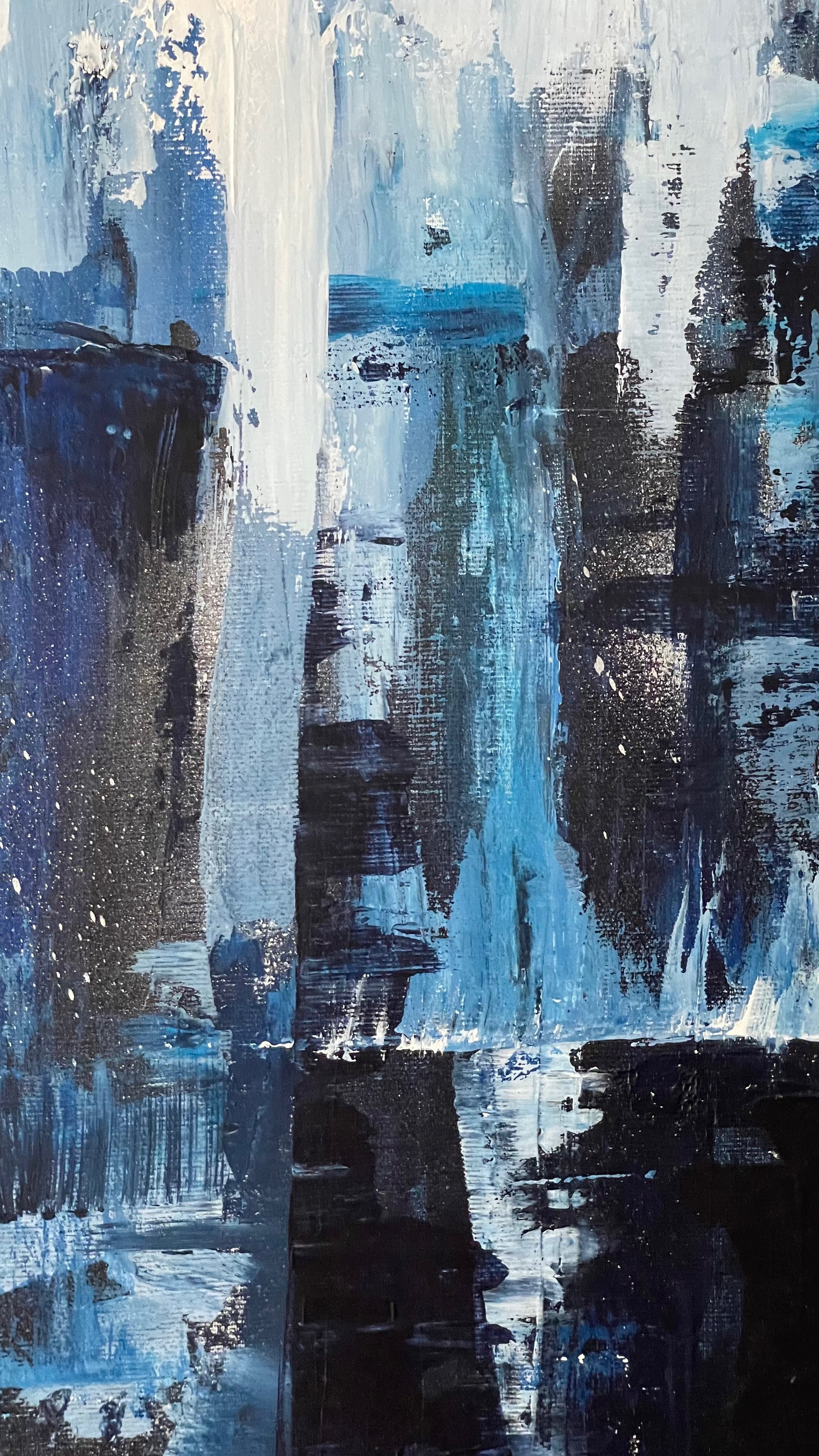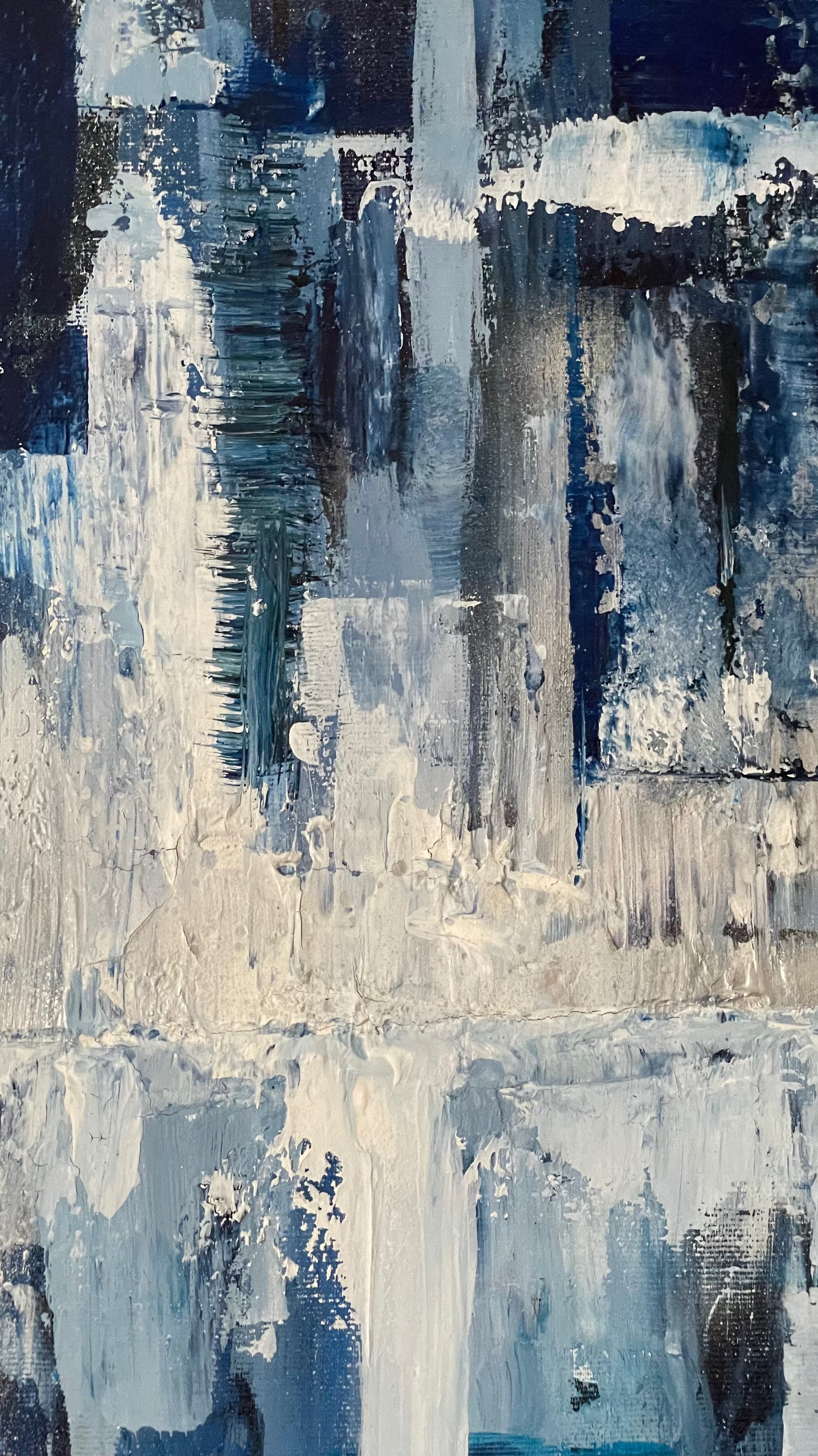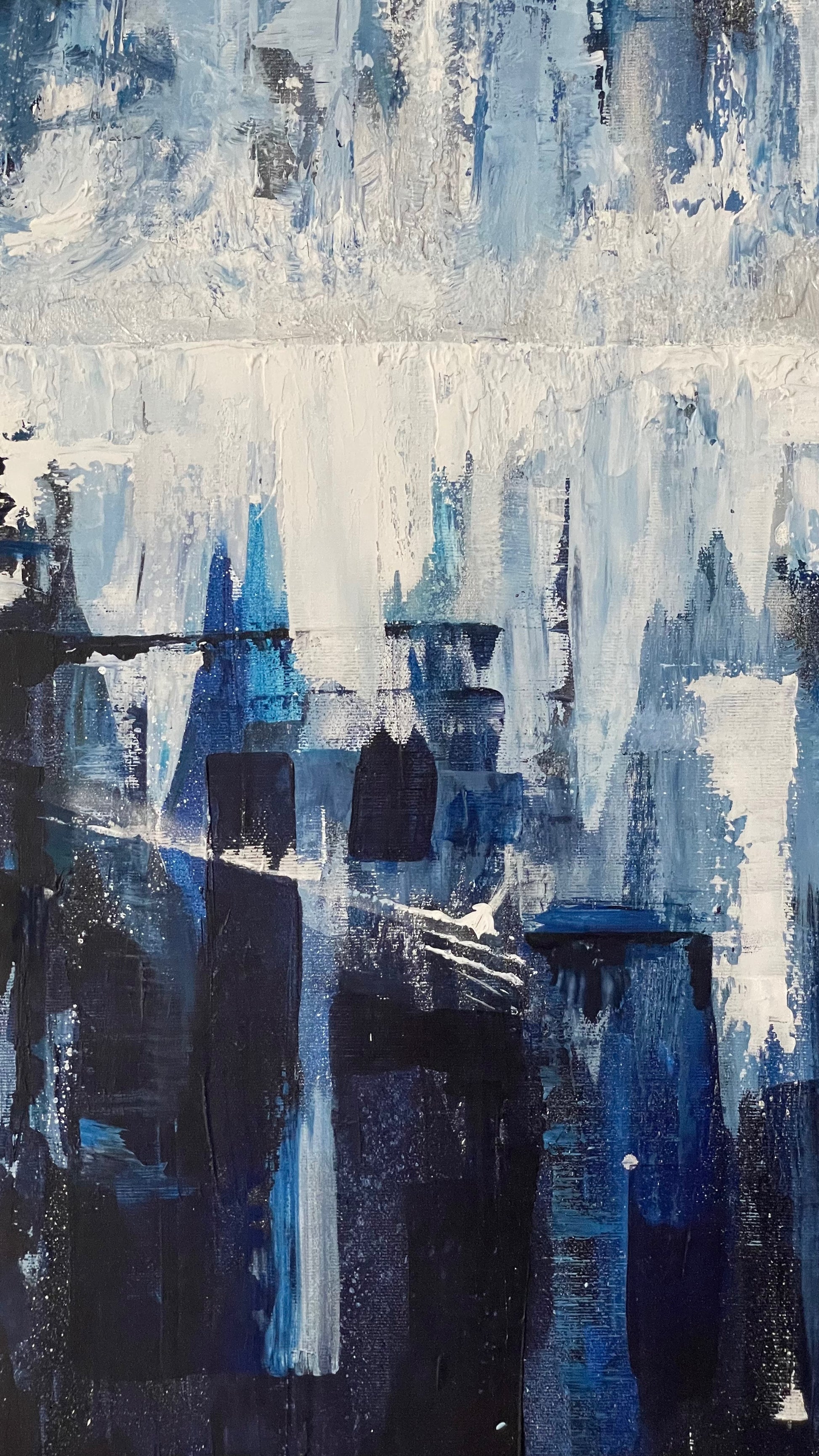 Bring a modern, sophisticated touch to any space with this stunning abstract painting. The bold 80x100 dimensions create a dramatic effect and the blue and white color scheme gives a moody yet fun twist. Impress guests and add a unique touch to your decor with the Icy Skyline.