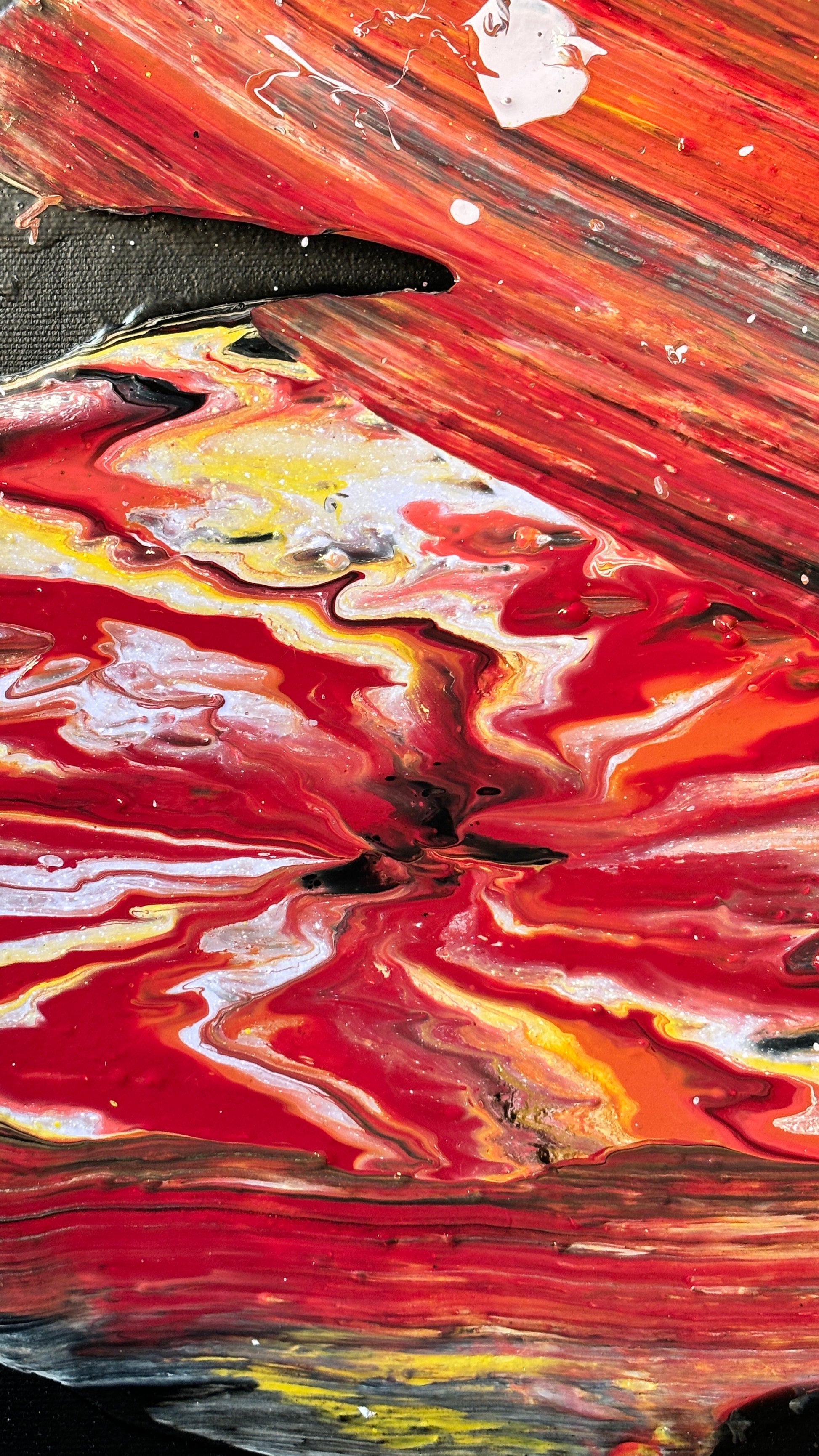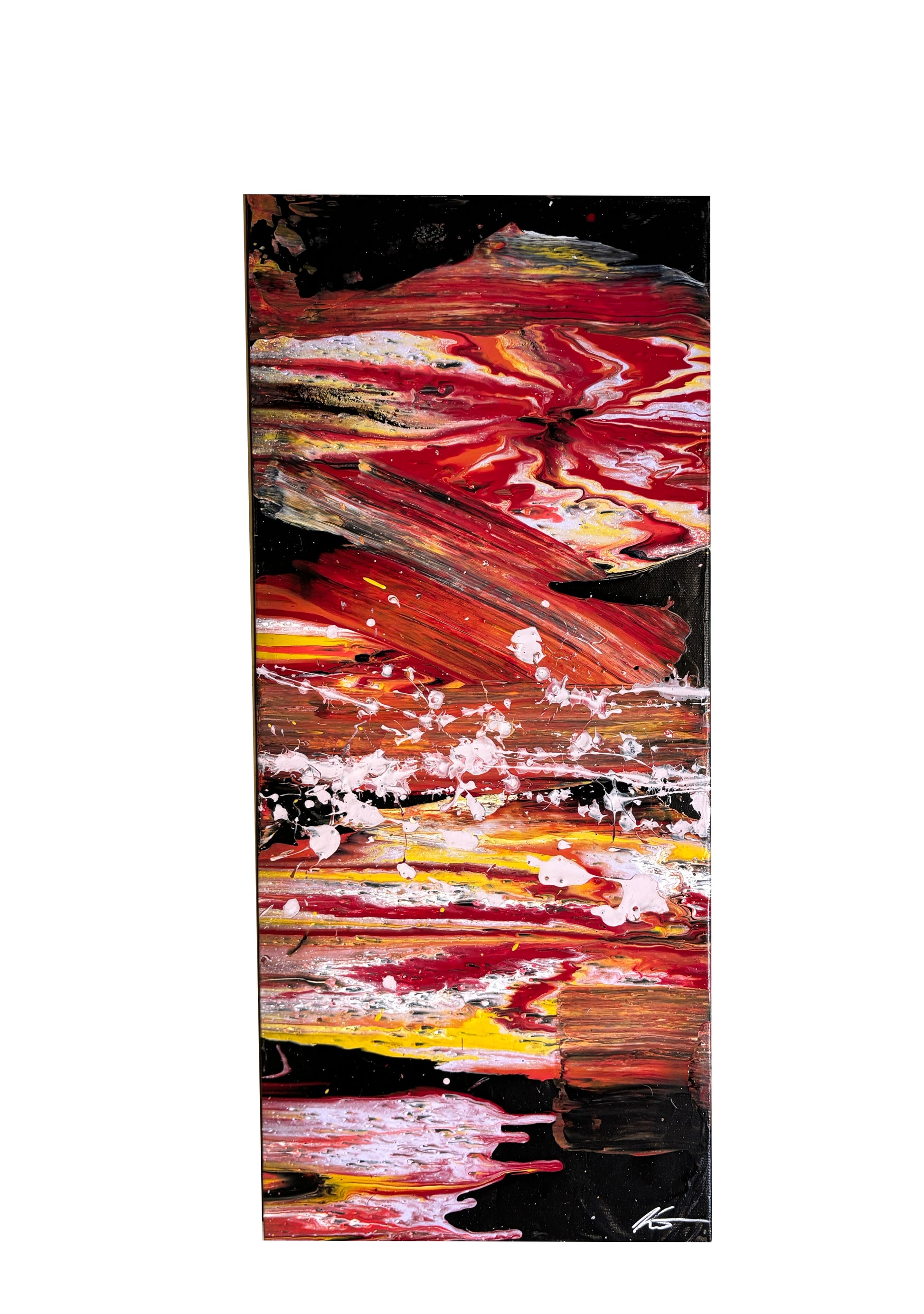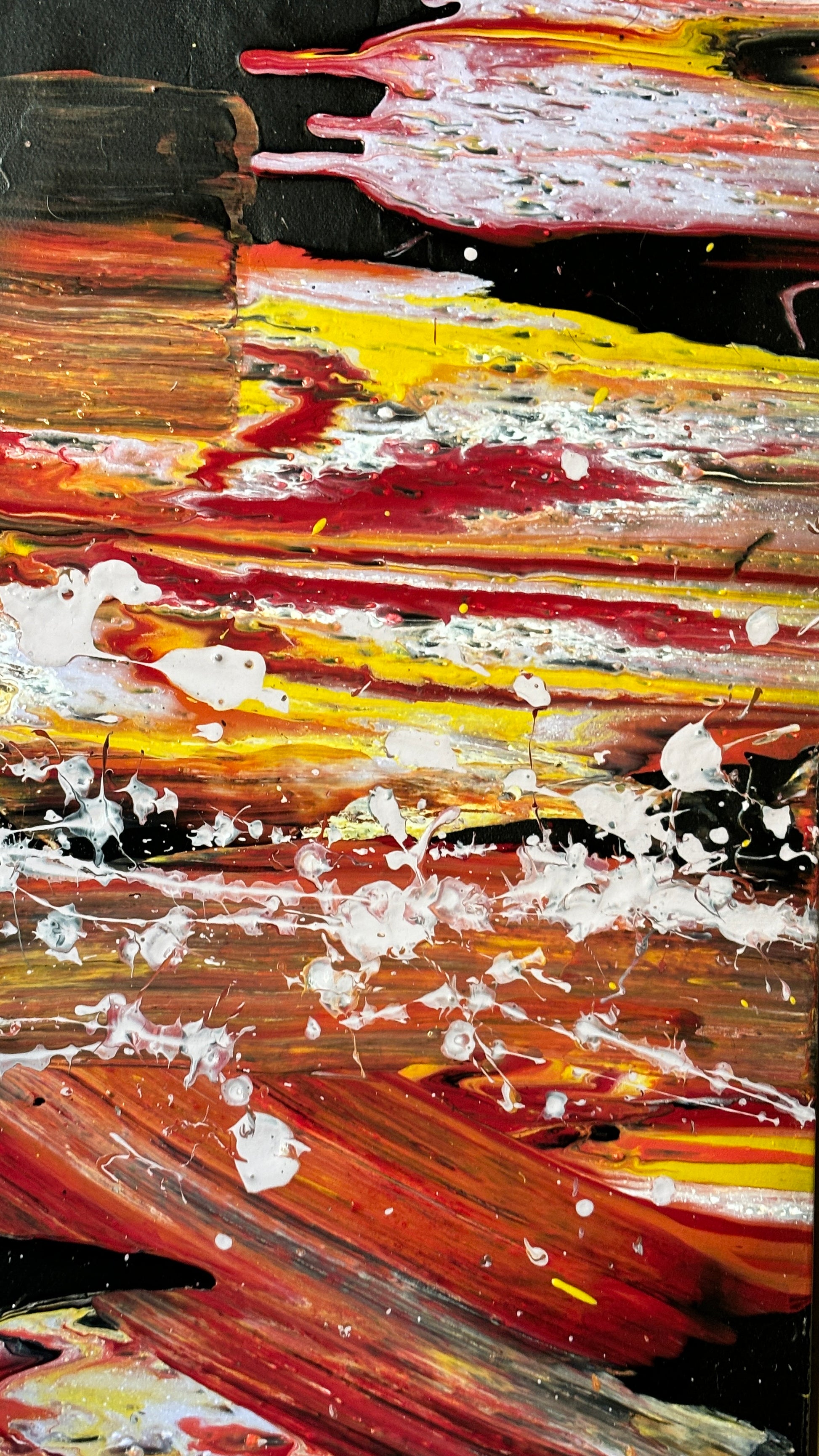 "Radiant Bloom" is a vibrant acrylic painting measuring 40x80 cm in height. The artwork is a striking display of dynamic reds, yellows, and blacks, evoking a powerful energy. The bold, sweeping brushstrokes and splatters create a sense of movement and intensity, capturing the chaotic beauty of nature's untamed forces. Each layer of paint adds depth and texture, drawing the viewer into a tumultuous dance of colors and forms. "Radiant Bloom" is a celebration of both the destructive and creative power of nature, inviting viewers to feel the heat and passion emanating from its fiery composition.